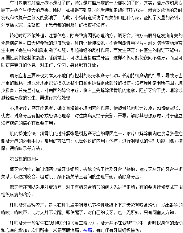 很多人都想了解預防磨牙癥惡化的措施與禁忌,為此,醫(yī)學教育網(wǎng)編輯特別整理了這篇關于預防磨牙癥惡化的措施與禁忌的文章,具體如下: