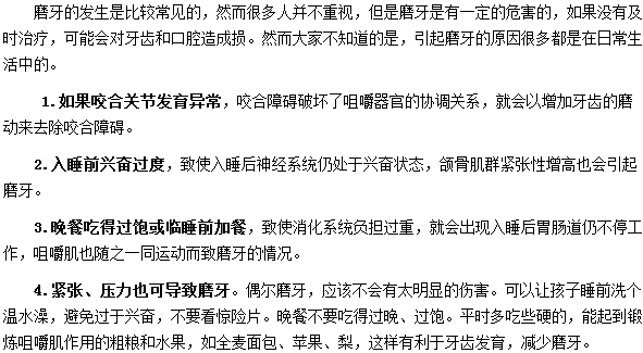 通過我們的介紹相信大家對(duì)日常生活中會(huì)引起磨牙的原因有了更多的了解,如果患有磨牙癥就要立即去醫(yī)院治療,不能拖延。治療時(shí)期要有耐心,不能半途而廢,不能灰心。
