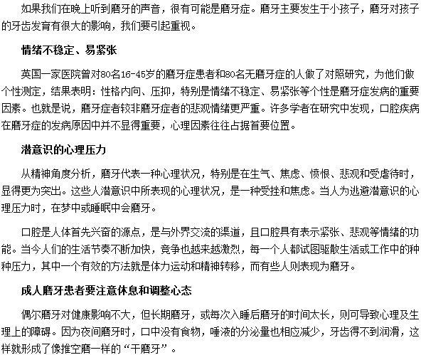 通過本篇文章了解到,成人磨牙患者要注意休息和調(diào)整心態(tài)。如果發(fā)生磨牙要及時的接受治療,并在生活中不斷的自我的心理調(diào)適,緩解情緒引起的磨牙癥狀。嚴重者要及時就醫(yī),以免耽誤病情。以上就是“成人磨牙患者要注意休息和調(diào)整心態(tài)”的具體內(nèi)容,更多內(nèi)容請繼續(xù)關(guān)注醫(yī)學教育網(wǎng)!