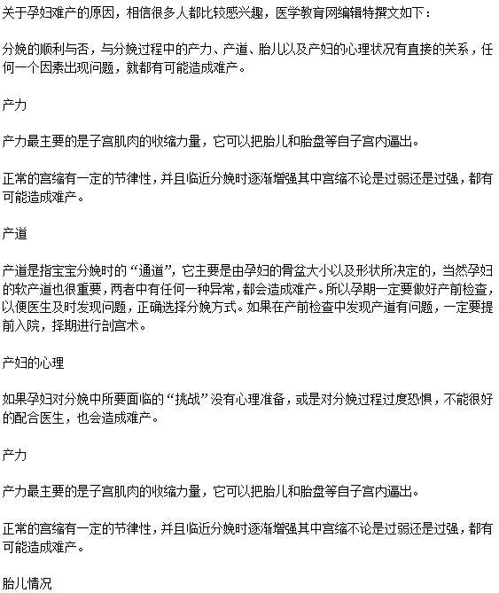 關(guān)于孕婦難產(chǎn)的原因,相信很多人都比較感興趣,醫(yī)學(xué)教育網(wǎng)編輯特撰文如下: