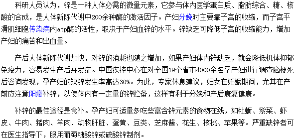 以上“鋅缺乏可導(dǎo)致孕婦出現(xiàn)難產(chǎn)的情況”的內(nèi)容就為大家介紹完了,相信大家在看完后已經(jīng)有所認(rèn)識(shí)了,孕媽媽們在孕期一定要注意合理補(bǔ)充營養(yǎng),避免出現(xiàn)難產(chǎn)的情況。