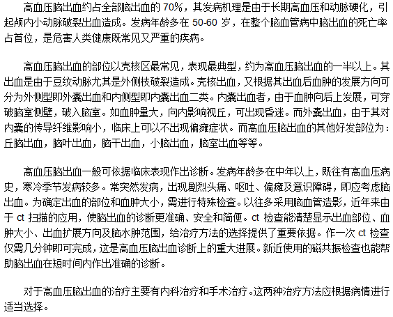 關(guān)于高血壓腦出血的知識(shí),相信很多人都想知道,醫(yī)學(xué)教育網(wǎng)編輯經(jīng)過(guò)多方搜尋,現(xiàn)將高血壓腦出血的相關(guān)內(nèi)容匯總給大家。