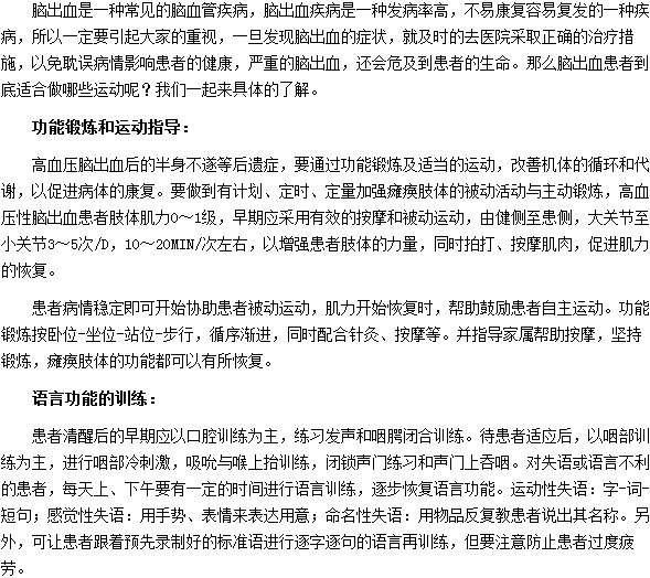 您想知道關(guān)于高血壓腦出血后的運(yùn)動(dòng)鍛煉及語言功能訓(xùn)練是什么嗎?相信您看了這篇有關(guān)高血壓腦出血后的運(yùn)動(dòng)鍛煉及語言功能訓(xùn)練的文章,您就了解了。