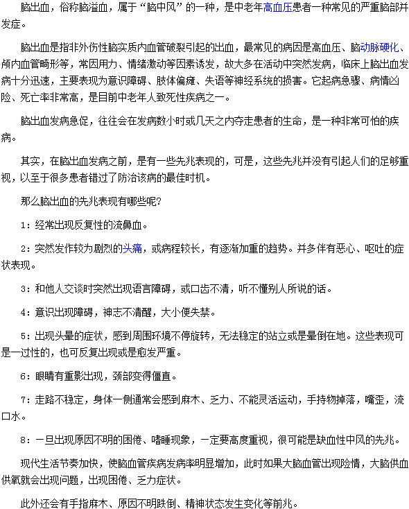 相信很多朋友都很關(guān)注出現(xiàn)腦出血的先兆表現(xiàn)有哪些?下面醫(yī)學(xué)教育網(wǎng)小編特為大家整理出現(xiàn)腦出血的先兆表現(xiàn)的相關(guān)內(nèi)容如下: