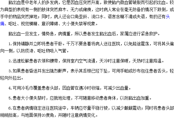 通過小編的介紹,相信大家對突發(fā)腦出血后家屬應采取的緊急救護措施的內容已經有所了解,小編也提醒大家,突發(fā)腦出血一定要進行緊急救護,及早送往醫(yī)院治療。