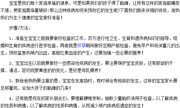 預(yù)防小兒腦癱的具體步驟及方法是什么?相信很多家長朋友都很想了解,為鄉(xiāng)村,醫(yī)學(xué)教育網(wǎng)小編特整理了預(yù)防小兒腦癱的具體步驟及方法的具體內(nèi)容,供大家參考。