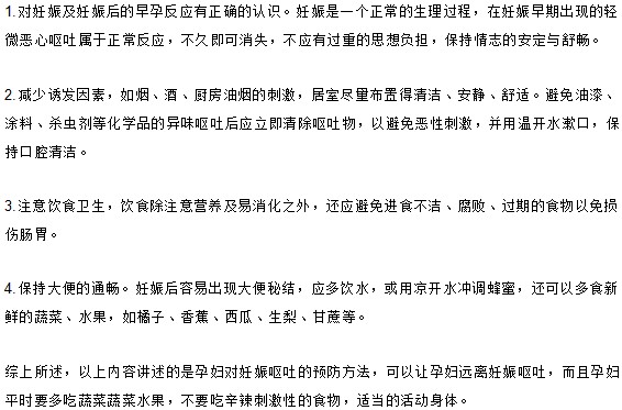 以上就是醫(yī)學(xué)教育網(wǎng)為您整理的關(guān)于預(yù)防妊娠嘔吐的方法的文章,特別提醒您,如果您有嚴(yán)重的妊娠嘔吐現(xiàn)象,請(qǐng)到正規(guī)醫(yī)院咨詢專(zhuān)業(yè)醫(yī)生,祝您健康順利生產(chǎn)!