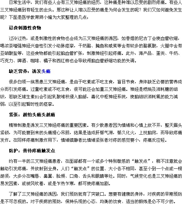 關(guān)于缺乏營養(yǎng)|防護缺失|緊張是引起三叉神經(jīng)痛的三大誘發(fā)因素的內(nèi)容,相信很多人都想知道,醫(yī)學教育網(wǎng)編輯經(jīng)過多方搜尋,現(xiàn)將缺乏營養(yǎng)|防護缺失|緊張是引起三叉神經(jīng)痛的三大誘發(fā)因素的具體內(nèi)容分享給大家,希望對大家有所幫助。