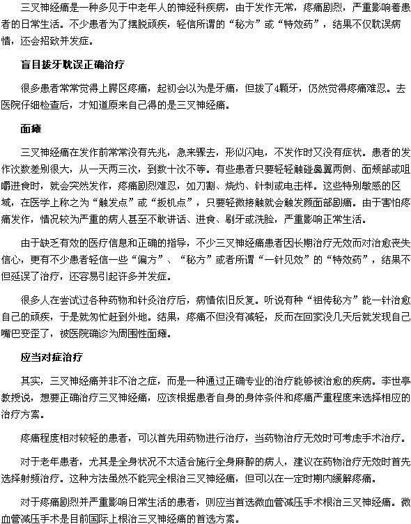 以上文章就是“三叉神經(jīng)痛切勿輕信秘方或特效藥”內(nèi)容的介紹。希望大家多了解一些關(guān)于三叉神經(jīng)痛的相關(guān)知識,千萬不要為了擺脫頑疾,輕信所謂的“秘方”或“特效藥”,結(jié)果不僅耽誤病情,還會招致并發(fā)癥。