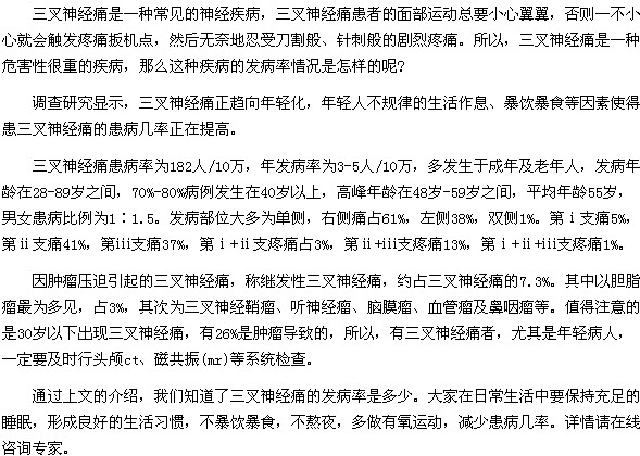以上就是“不良的生活飲食習慣使三叉神經痛的發(fā)病趨向年輕化”的內容,相信大家已經有所了解,在日常生活中要保持充足的睡眠,形成良好的生活習慣,不暴飲暴食,不熬夜,多做有氧運動,減少患病幾率。