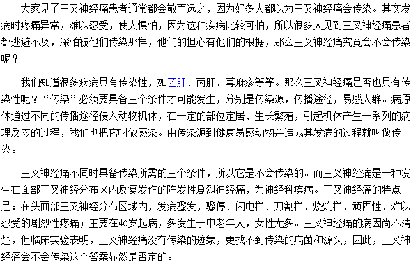 三叉神經(jīng)痛究竟會(huì)不會(huì)傳染呢?很多人都想了解狂三叉神經(jīng)痛究竟會(huì)不會(huì)傳染,為此,醫(yī)學(xué)教育網(wǎng)編輯特別整理了這篇關(guān)于狂三叉神經(jīng)痛究竟會(huì)不會(huì)傳染的文章,具體如下: