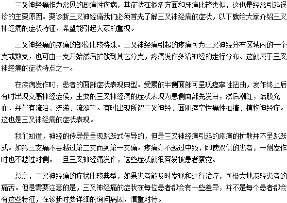 以上就是關于患上三叉神經(jīng)痛要知道其癥狀特征對癥治療的內(nèi)容,如果患有三叉神經(jīng)痛要及時對癥治療,防止病情加重,引起一些更為劇烈的疼痛,希望對三叉神經(jīng)痛患者有所幫助。