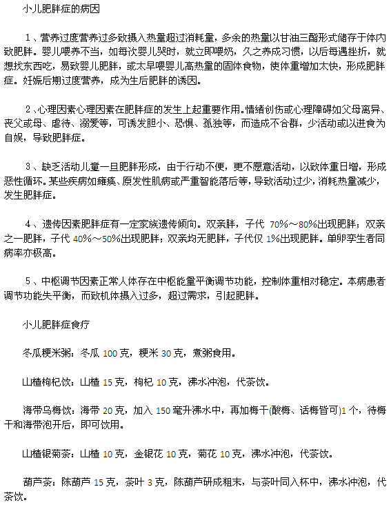 肥胖癥分兩大類,無明顯病因者稱單純性肥胖癥,兒童大多數(shù)屬此類;有明顯病因者稱繼發(fā)性肥胖癥,常由內(nèi)分泌代謝紊亂、腦部疾病等引起。研究表明,小兒肥胖癥與冠心病、高血壓和糖尿病等有密切關(guān)系。因此,有必要對(duì)小兒單純生肥胖癥早期進(jìn)行干預(yù)。這篇文章主要敘述單純性肥胖癥。