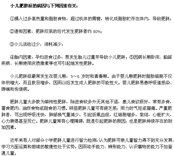 小兒肥胖癥是由于長期能量攝入超過消耗,導(dǎo)致體內(nèi)脂肪積聚過多而造成的疾病。體重超過同年齡、同身高小兒正常標準的20%,即可稱為肥胖。小兒肥胖癥與成人肥胖癥、冠心病、高血壓、糖尿病有一定關(guān)聯(lián),近年來報道肥胖對兒童智力發(fā)育也有影響,故應(yīng)及早預(yù)防。