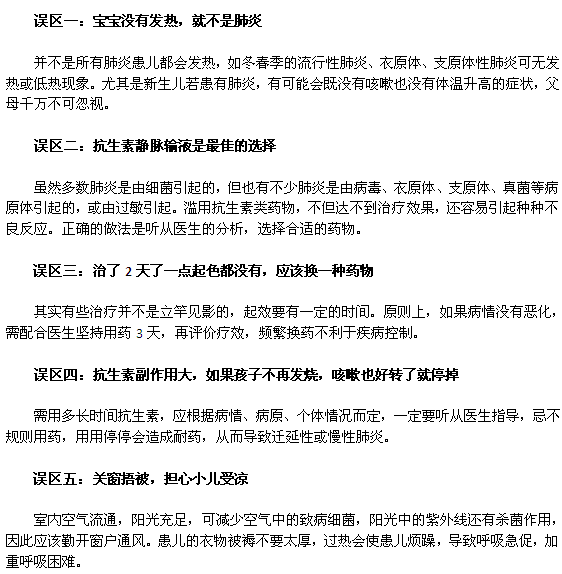 小兒肺炎是臨床常見病,四季均易發(fā)生,以冬春季為多。臨床表現(xiàn)為發(fā)熱、咳嗽、呼吸困難,也有不發(fā)熱而咳喘重者,如不及時(shí)治療,可發(fā)展為重癥肺炎,或者出現(xiàn)心力衰竭、呼吸衰竭、肺性腦病等嚴(yán)重危及生命的并發(fā)癥。小兒肺炎如治療不徹底,則易反復(fù)發(fā)作,影響孩子發(fā)育。但是,許多家長對小兒肺炎的認(rèn)識存在誤區(qū),最常見的是以下五種: