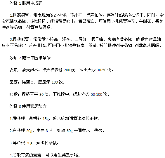 寶寶患感冒后,如果癥狀不重、沒有發(fā)熱,可根據(jù)出現(xiàn)的癥狀和表現(xiàn),在家中向醫(yī)生咨詢,并在醫(yī)生指導(dǎo)下酌情服用一些中成藥或者使用一些小療法,都是很有效果的。
