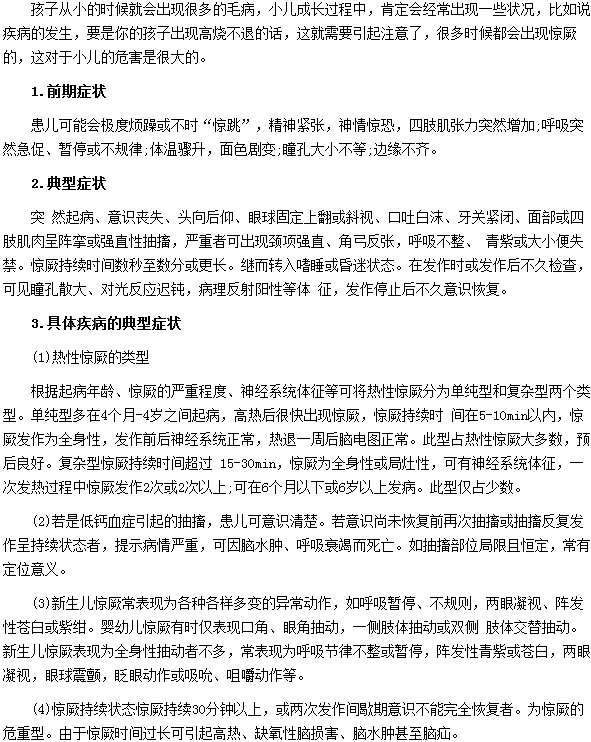關(guān)于小兒驚厥前期的典型癥狀有哪些,小編已經(jīng)為大家介紹的很清楚了,要是你的孩子出現(xiàn)這些早期癥狀的話,一定不要耽誤及時(shí)到大的醫(yī)院進(jìn)行治療,從而讓你的孩子遠(yuǎn)離驚厥這種影響生命和健康的疾病。