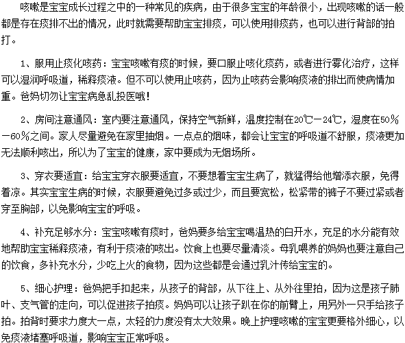 如果你的寶寶咳嗽的時(shí)候有痰排不出,就需要按照以上小編介紹的方法進(jìn)行排痰及護(hù)理,而且要注意家里的通風(fēng)換氣工作,當(dāng)然飲食上不要讓寶寶吃上火的食物,多吃清淡的火氣小的食物。