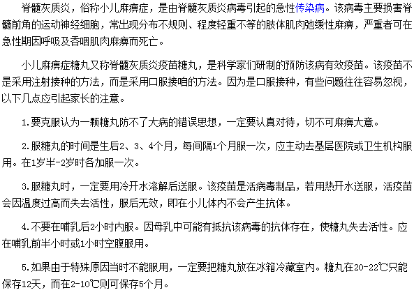 以上就是小編為您整理的有關(guān)服用小兒麻痹癥糖丸應(yīng)注意什么的文章,相信大家在經(jīng)過(guò)對(duì)上文的閱讀后應(yīng)該對(duì)于服用小兒麻痹癥糖丸應(yīng)注意什么有了一定的了解,希望可以對(duì)大家有幫助。