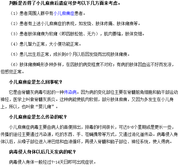 以上就是關于判斷是否得了小兒麻痹后遺癥有哪些方面的相關信息,相信大家已經有所了解。在日常生活中,大家應該積極的去關注小兒麻痹患兒,讓他們通過治療能夠盡早恢復健康。本網站所發(fā)布的文章并不意味著贊同或證實其觀點,僅作為參考信息使用。疾病診療或藥品選用等專業(yè)問題請及時到醫(yī)院就診或咨詢相關醫(yī)生。