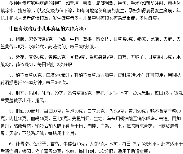 關(guān)于中醫(yī)有效治療小兒麻痹癥的六種方法,相信很多患有小兒麻痹癥的兒童家長都很想了解,醫(yī)學(xué)教育網(wǎng)編輯特整理中醫(yī)有效治療小兒麻痹癥的六種方法的內(nèi)容如下: