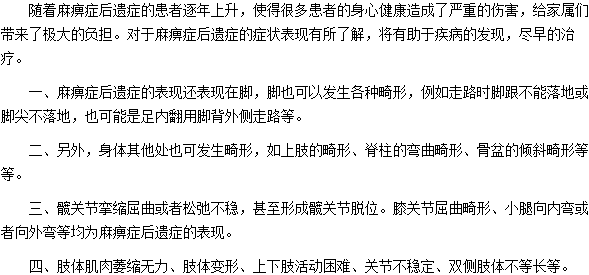 相信很多人都想知道小兒麻痹后遺癥的癥狀在身體上有哪些表現(xiàn)?下面請大家仔細(xì)閱讀醫(yī)學(xué)教育網(wǎng)編輯專門為您整理的小兒麻痹后遺癥的癥狀在身體上有哪些表現(xiàn)這篇文章吧。