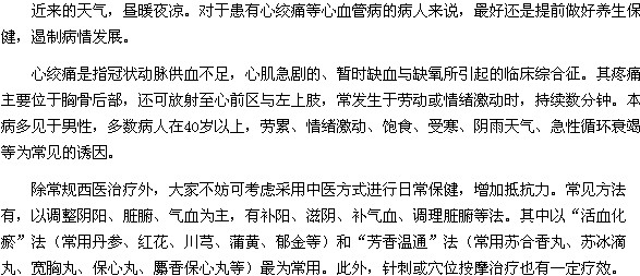 關(guān)于天氣晝暖夜涼要慎防心絞痛的發(fā)生,看了上述內(nèi)容的介紹,相信大家已經(jīng)了解了,希望可以幫到大家,心絞痛是一種很嚴(yán)重的癥狀,最好還是提前做好養(yǎng)生保健,遏制病情發(fā)展。