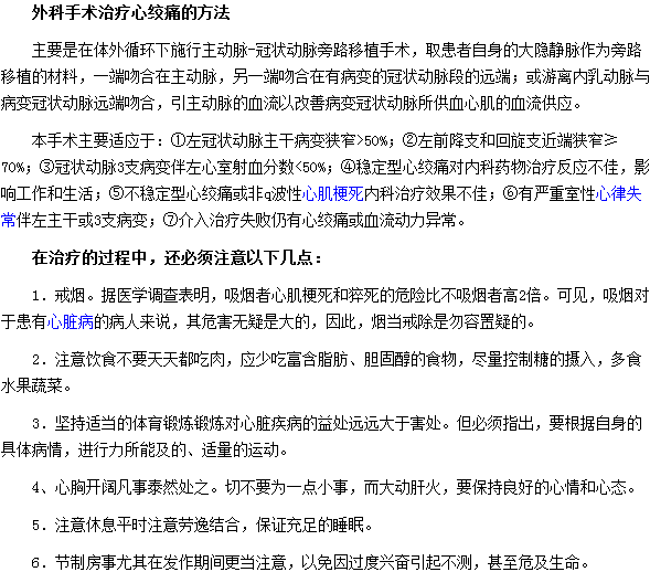心絞痛是冠狀動(dòng)脈供血不足,暫時(shí)缺血和缺氧所發(fā)生的發(fā)作性胸痛或胸部不適為主要表現(xiàn)的臨床綜合癥。嚴(yán)重危害患者生活,那么,手術(shù)治療心絞痛的方法及注意事項(xiàng)是什么呢?下面醫(yī)學(xué)教育網(wǎng)小編就為大家整理了手術(shù)治療心絞痛的方法及注意事項(xiàng)的具體內(nèi)容,供大家參考。