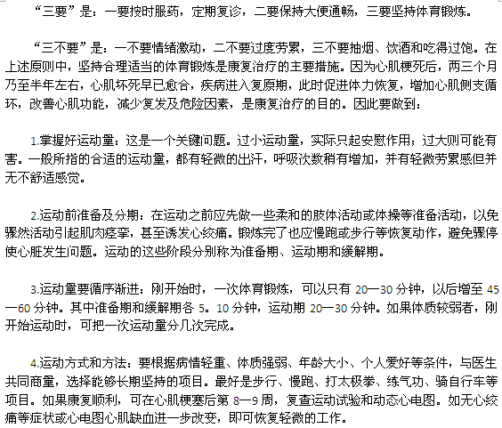 急性心肌梗塞的病人,在醫(yī)院度過了急性期后,如病情平穩(wěn),醫(yī)生會(huì)允許回家進(jìn)行康復(fù)治療。那么在家怎樣進(jìn)行自我康復(fù)治療呢?總的原則是做到“三要”、“三不要”。下面讓小編給大家詳細(xì)介紹下: