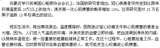 您知道嗎?溫差大于10℃容易引發(fā)心肌梗塞,想知道這是怎么一回事嗎?相信您看了這篇有關(guān)心肌梗塞的文章,您就了解了。