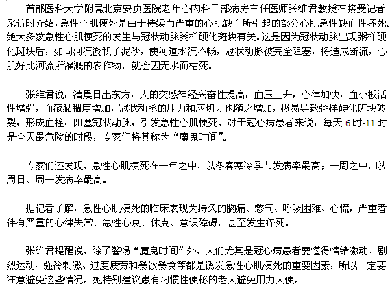 人體的生物代謝與自然界的變化息息相關(guān),專家們通過觀察發(fā)現(xiàn),一些疾病的發(fā)生有著比較明顯的時間規(guī)律,比如要防范急性心肌梗死,千萬不能忽視最易發(fā)生急性心肌梗死的“魔鬼時間”。