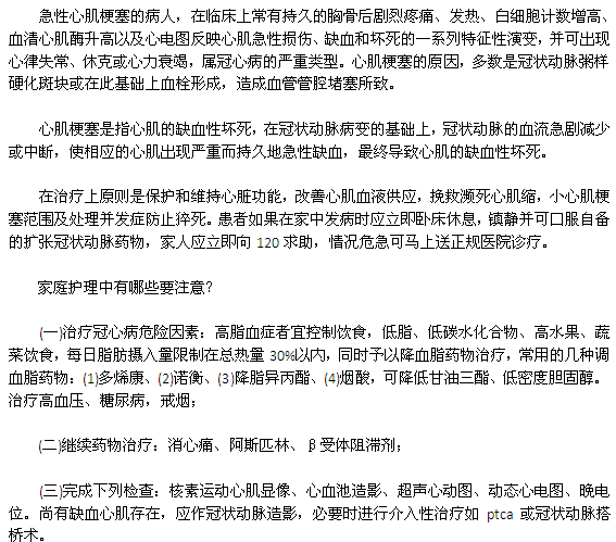 心肌梗塞是一種致命的急性病,很多人都想了解它的家庭護理方法,為此,醫(yī)學教育網(wǎng)編輯特別整理了這篇關(guān)于預防心肌梗塞的家庭護理的文章,具體如下: