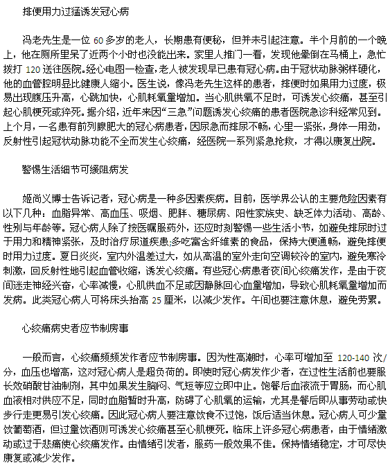 小編提醒說,冠心病人在生活中如果學會自我防護,可有效延緩或阻止冠心病的發(fā)生。比如下面這三件事冠心病人就一定要注意: