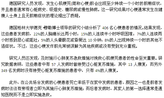 心肌梗死是一種很嚴(yán)重的疾病,稍有不慎就會危及生命。但是心肌梗死在發(fā)病前也是有前兆的,下面小編帶您了解下心肌梗塞的先兆都有哪些。