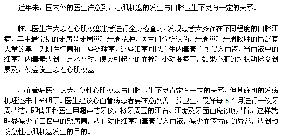 您知道嗎?口腔不潔竟然容易引起心肌梗塞,想知道這是怎么一回事嗎?相信您看了這篇有關(guān)心肌梗死的文章,您就了解了。