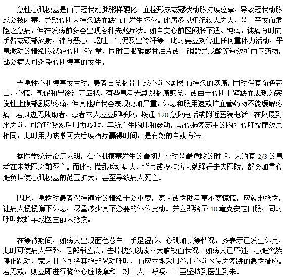 心肌梗死是一種很嚴(yán)重的疾病,稍有不慎就會(huì)危及生命。如果身邊的病人突然出現(xiàn)心肌梗塞該怎么辦呢?下面小編帶您了解下心肌梗塞的緊急處理。