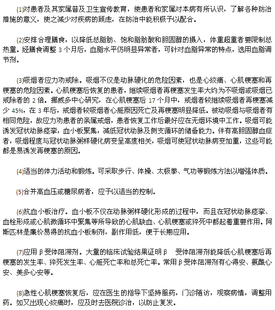 近20年來(lái),由于加強(qiáng)監(jiān)護(hù)和治療水平的提高,急性心肌梗塞住院病死率明顯降低,從30%左右降至10%以下。但再梗塞或多次梗塞的患者增多,成為心肌梗塞后死亡的主要原因之一。因此除在急性期應(yīng)積極治療外,還應(yīng)加強(qiáng)心肌梗塞后的康復(fù)和二級(jí)預(yù)防,以延長(zhǎng)患者壽命,提高生活質(zhì)量和恢復(fù)工作能力。心肌梗塞后的積極預(yù)防包括: