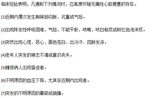 由于心肌梗塞的預(yù)后與疼痛的程度無關(guān),無痛性心肌梗塞老年人好發(fā),且就診晚,并發(fā)癥多,易誤診漏診等原因,死亡率反而高于有疼痛癥狀者。當(dāng)遇到上述情況時(shí),應(yīng)及時(shí)到醫(yī)院做心電圖等相關(guān)檢查,進(jìn)一步明確診斷。