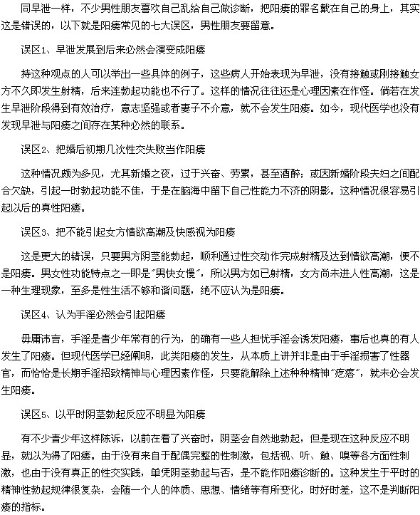 現(xiàn)今陽(yáng)痿的發(fā)病率越來(lái)越高,很多男性朋友認(rèn)為早泄發(fā)展到后來(lái)必然會(huì)演變成陽(yáng)痿,那么,早泄必然會(huì)演變成陽(yáng)痿嗎?男性陽(yáng)痿一定要避免走進(jìn)的誤區(qū)有哪些?醫(yī)學(xué)教育網(wǎng)小編特整理了下面的文章供大家參考,希望對(duì)廣大男性朋友能夠有所幫助。