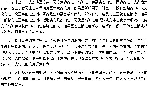 相信很多男性朋友在得知自己患上陽(yáng)痿后,往往會(huì)會(huì)有病亂求醫(yī),見(jiàn)病亂用藥,不但病沒(méi)治好,有的還出現(xiàn)了副作用,添了新病。為此,醫(yī)學(xué)教育網(wǎng)編輯特地為您準(zhǔn)備了相關(guān)的文章,希望對(duì)您有幫助。