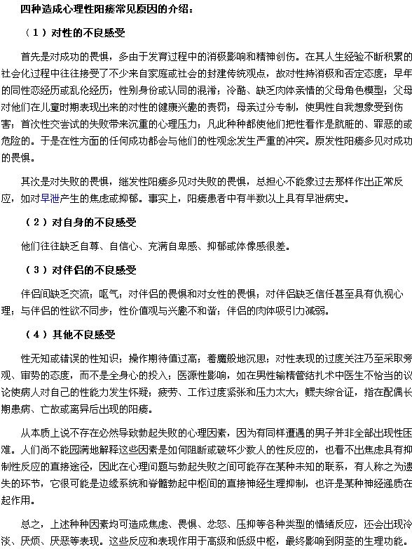 關(guān)于四種造成心理性陽(yáng)痿常見(jiàn)原因有哪些?相信很多男性朋友都很感興趣,醫(yī)學(xué)教育網(wǎng)小編經(jīng)過(guò)多方搜尋,現(xiàn)將四種造成心理性陽(yáng)痿常見(jiàn)原因有哪些的具體內(nèi)容介紹給大家,供廣大男性朋友了解。