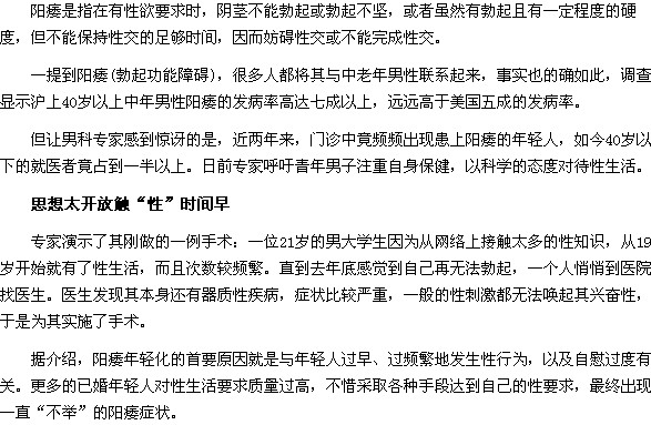 過早的性接觸可能會導(dǎo)致陽痿的發(fā)生,關(guān)于陽痿相信這是很多男性朋友都非常關(guān)注的問題,那么你知道過早的性接觸可能會導(dǎo)致陽痿的發(fā)生嗎?下面醫(yī)學(xué)教育網(wǎng)小編特為大家整理了相關(guān)內(nèi)容介紹如下: