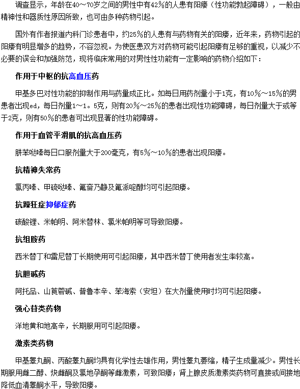 臨床常用的會(huì)引起陽(yáng)痿的藥物有哪些?相信很多人都想知道,那么,臨床常用的會(huì)引起陽(yáng)痿的藥物究竟有哪些?相信大家看了下面這篇文章就會(huì)明白了。