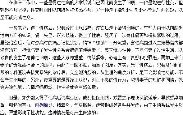 相信很多人會對如果得了性病會不會引起陽痿的問題比較感興趣,為此,醫(yī)學(xué)教育網(wǎng)編輯特地為您準(zhǔn)備了這篇關(guān)于如果得了性病會不會引起陽痿的文章,希望對您有幫助。
