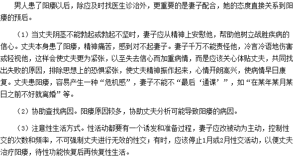 關于男人患陽痿妻子的態(tài)度對預后有直接關系的內(nèi)容,相信很多人都想知道,下面醫(yī)學教育網(wǎng)小編就為大家介紹具體內(nèi)容如下: