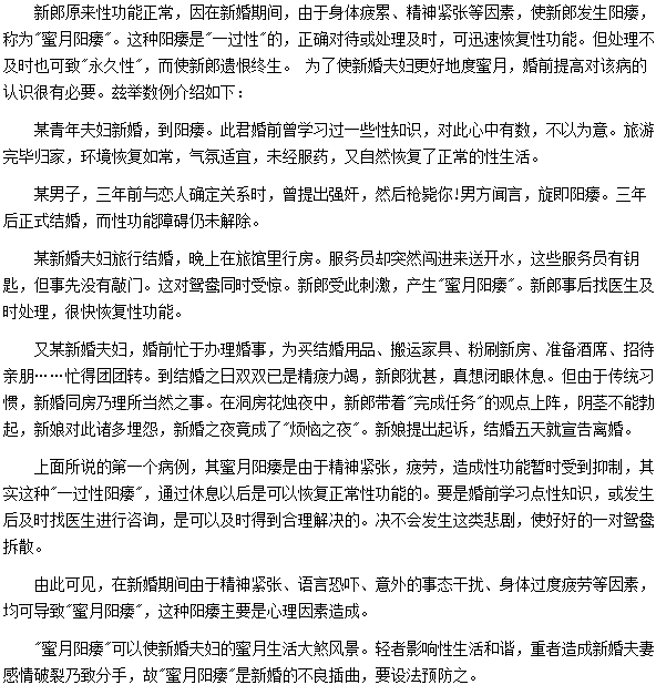 關(guān)于新婚期如何防止發(fā)生陽(yáng)痿的情況的內(nèi)容,很多男性朋友都想知道,醫(yī)學(xué)教育網(wǎng)編輯經(jīng)過(guò)多方搜尋,現(xiàn)將新婚期如何防止發(fā)生陽(yáng)痿的情況的內(nèi)容分享給大家。