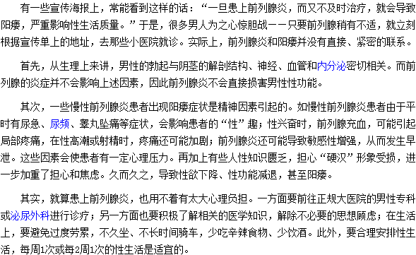 相信很多人都想知道前列腺炎不及時治療一定會導致陽痿嗎?下面請大家仔細閱讀醫(yī)學教育網(wǎng)編輯專門為您整理的這篇“前列腺炎不及時治療一定會導致陽痿嗎”文章吧。