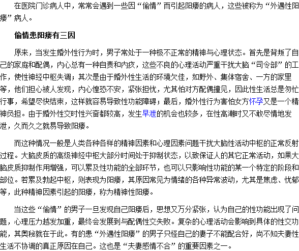 為什么男人偷情會(huì)容易引起陽痿?什么是房水,相信很多人都想知道,那么為什么男人偷情會(huì)容易引起陽痿呢?相信大家看了下面這篇文章就會(huì)明白了。