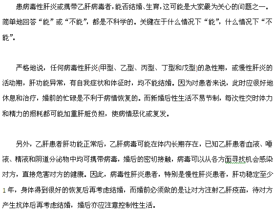 總之,患病毒性肝炎后或病毒攜帶者,并不是不能結(jié)婚,但一定要選擇好結(jié)婚和生育的時(shí)機(jī),并在醫(yī)生的密切觀察及指導(dǎo)下,采取必要的措施?,F(xiàn)在您了解了吧,小編提醒您一定要遵循醫(yī)生的建議。真心的希望我們的分享能夠?yàn)槟峁椭?請(qǐng)您務(wù)必自己的身體情況,如果身體信號(hào)亮出了紅燈,一定要及早與醫(yī)生溝通。在此祝您身體健康!