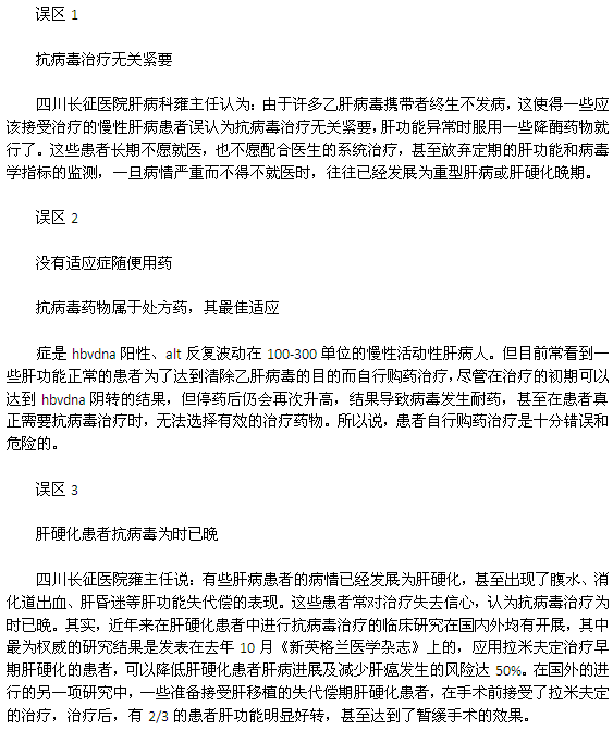 我國(guó)是肝?。╤ b v)感染的高發(fā)區(qū),慢性肝病患者約3000萬(wàn)人,部分患者可發(fā)展為肝硬化或原發(fā)性肝癌。關(guān)于慢性肝病的治療目標(biāo),目前國(guó)際、國(guó)內(nèi)學(xué)術(shù)界已達(dá)成共識(shí),就是長(zhǎng)期抑制病毒復(fù)制,延緩肝病的進(jìn)展。而達(dá)成上述治療目標(biāo),抗病毒治療是關(guān)鍵。但是在臨床工作中,發(fā)現(xiàn)許多患者對(duì)抗病毒治療有認(rèn)識(shí)上的偏差,使治療中存在種種誤區(qū)。下面小編就和大家談?wù)勥@五大誤區(qū):